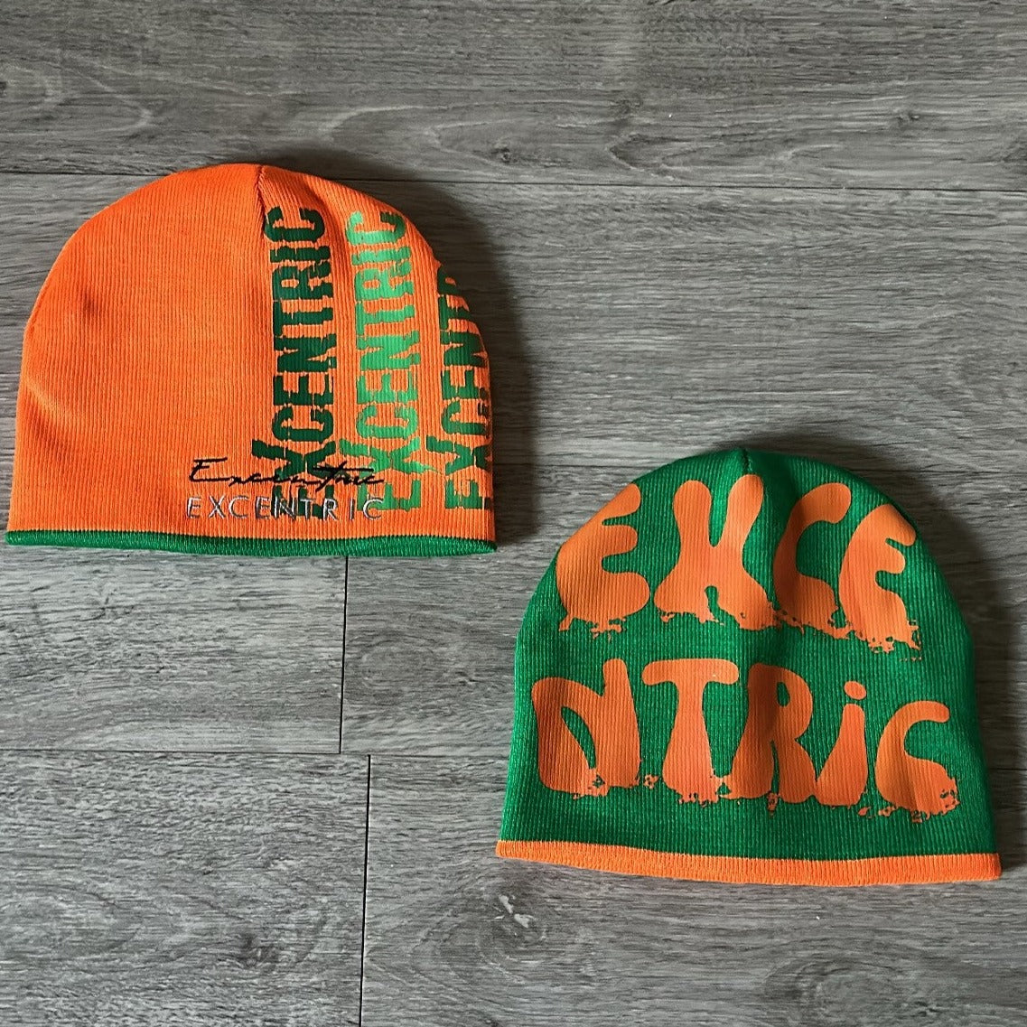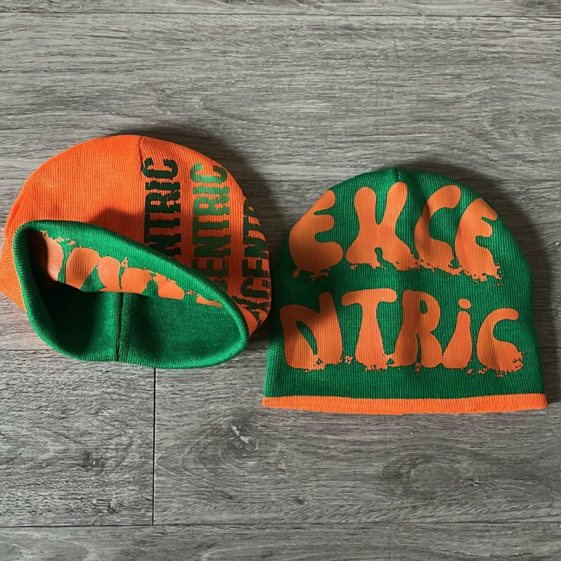 - One size fits all soft premium-quality cotton orange and green reversible beanie with screen print designs on both sides and embroidered logos.